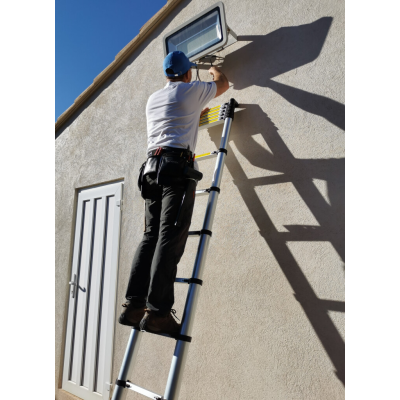 Viengubos PRO SOFT serijos teleskopinės aliumininės kopėčios, pagamintos pagal griežtą EN-131-6 TUV standartą. Kopėčių maksimali apkrova siekia 150 kg.