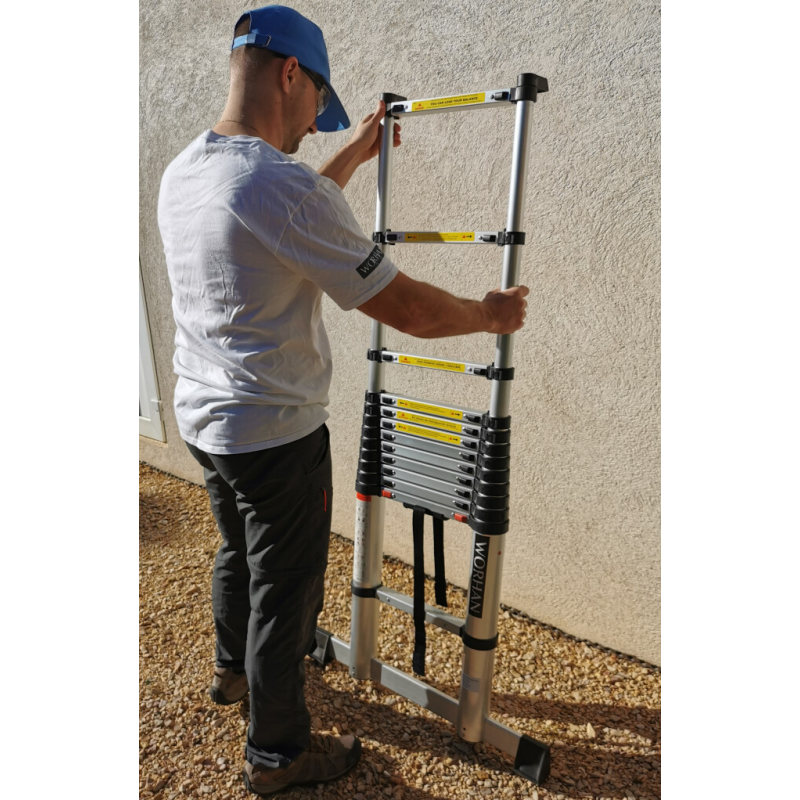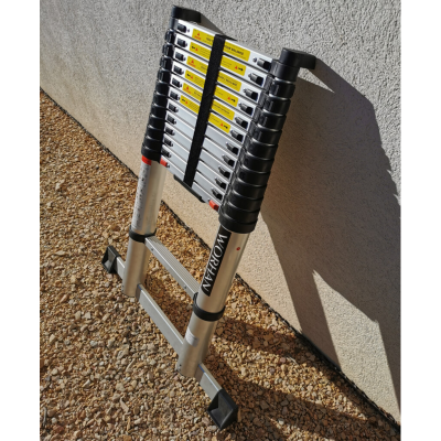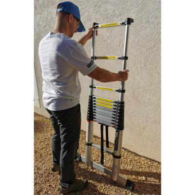 Viengubos PRO SOFT serijos teleskopinės aliumininės kopėčios, pagamintos pagal griežtą EN-131-6 TUV standartą. Kopėčių maksimali apkrova siekia 150 kg.