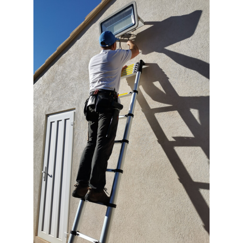 Viengubos PRO SOFT serijos teleskopinės aliumininės kopėčios, pagamintos pagal griežtą EN-131-6 TUV standartą. Kopėčių maksimali apkrova siekia 150 kg.